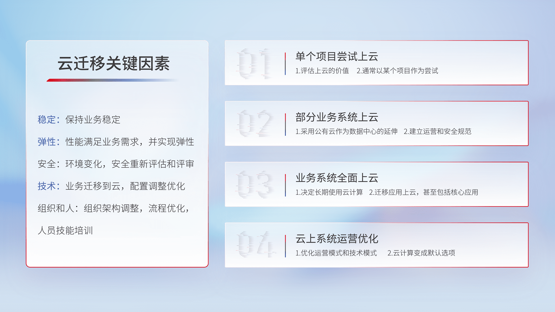 结合实际业务,,从规划设计、、云平台选型、、、、云原生改造、、数据迁移、、集成交付,,,迁移全过程为客户识别最佳上云路径,,,做好风险识别管理,,,设计网络架构、、、、身份权限、、、、安全审计合规、、操作审计、、、、日志审计、、监控告警策略、、多站点容灾设计等,,对云上基础设施进行整体规划,,,,提升IT治理水平,,以满足弹性、、、高可用、、、高性能的需求。。