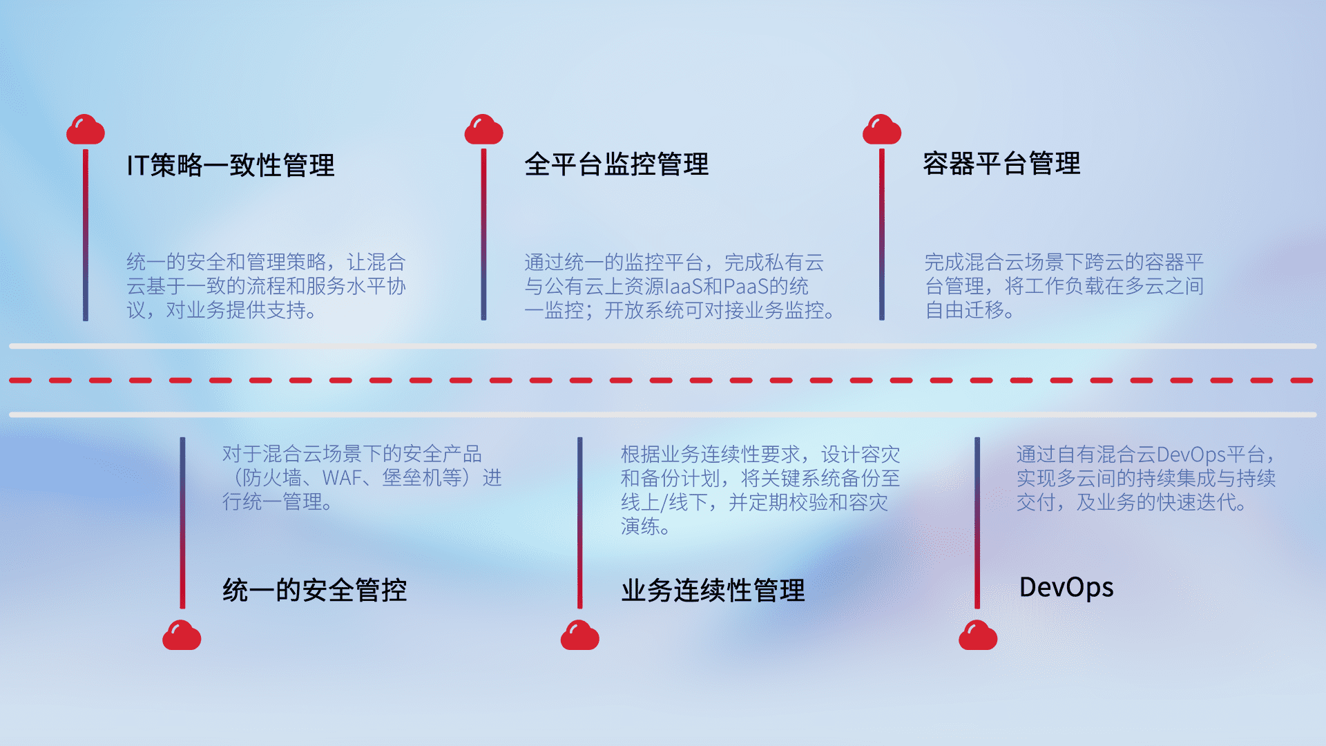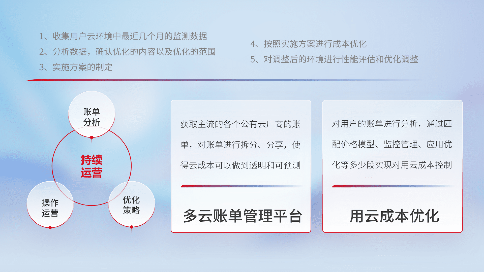 通过多云纳管,,,,以统一的资源数据模型把客户的云资源进行抽象和封装,,,,进而实现对多云资源的统一操作,,保障云资源管理的可靠性、、、稳定性与可用性。。。。量身定制化运维内容,,配置、、、、开发运维、、补丁管理、、备份、、、、监控、、、认证和访问管理、、审计和日常巡检等,,保障在用云过程中的可靠度,,,,稳定度以及高可用率。。