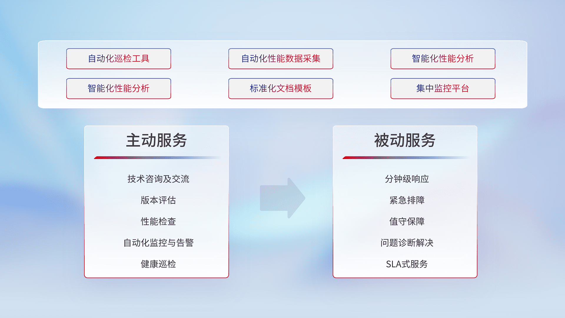 智能化工具和标准化文档,,,,保障服务质量,,,提供主动服务(包含技术咨询、、、、版本评估、、、性能检查、、、自动化监控与告警、、、健康巡检)和被动服务包含(分钟级响应、、、紧急排障、、值守保障、、、问题诊断解决、、、、SLA服务)。。。