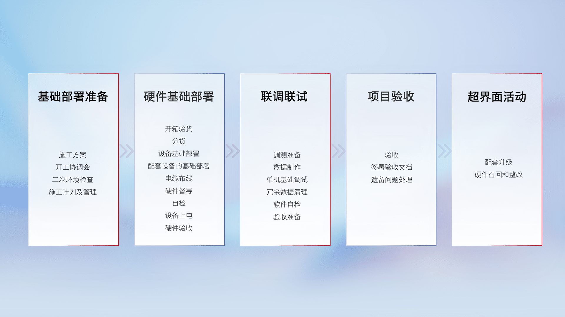 从基础部署准备、、、、硬件基础部署、、、联调联试、、、、项目验收、、、、越界面活动的全过程可追溯,,保证施工质量和进度。。。