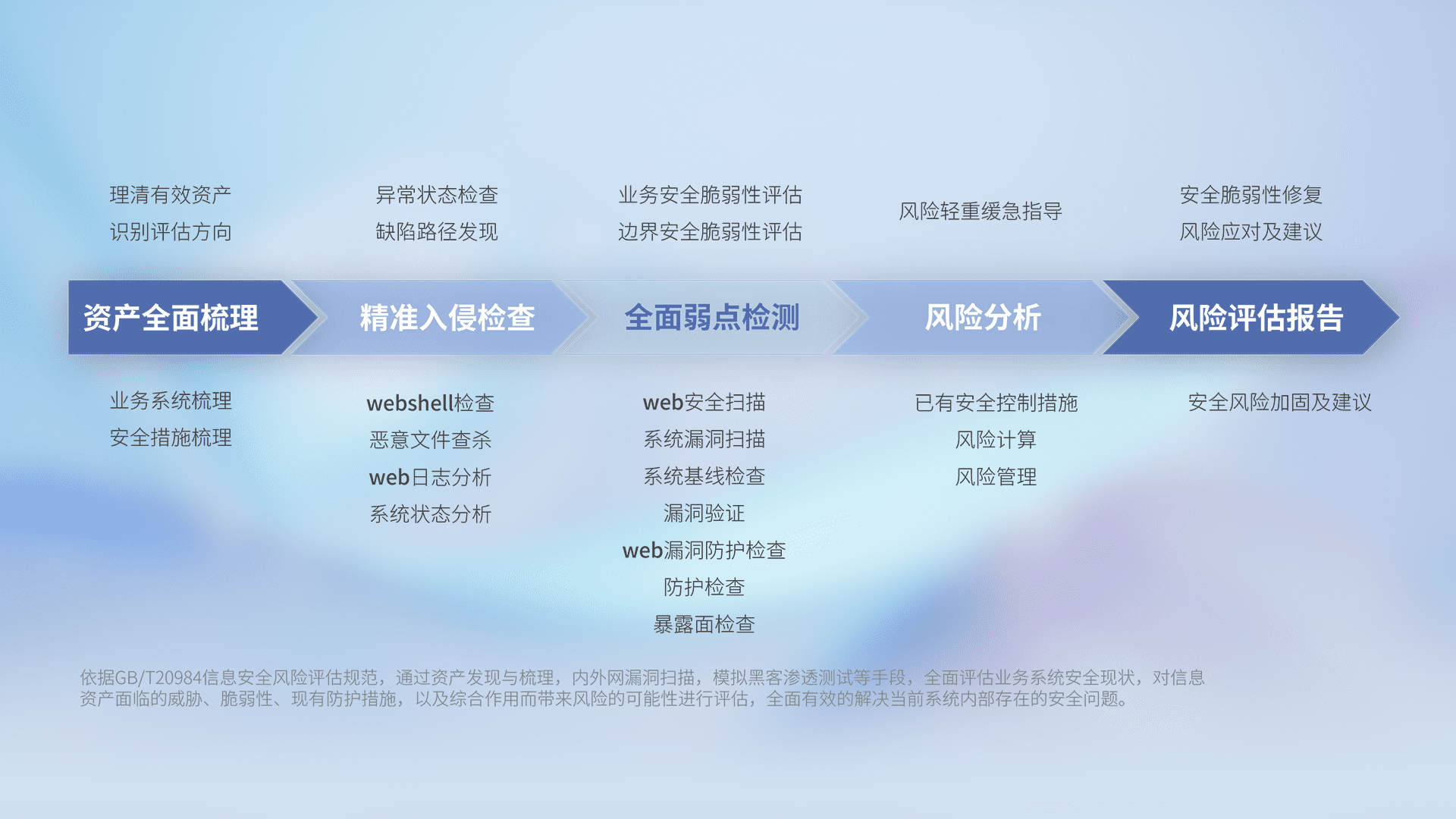 针对客户行业特性,,以专业的安全服务+多厂商联合解决方案提供专属的一站式安全管理服务,,,帮助客户全面感知网络空间威胁,,基于识别、、、检测、、分析、、防护、、、监测、、响应的服务理论模型,,,,从方案咨询、、、集成交付、、、、评估验证、、、优化加固、、运维运营,,,,致力于为客户提供完整的闭环管理式安全服务。。。。以实战经验为客户打造高抵御风险的安全体系,,,帮助客户发现威胁、、、对抗威胁、、、处置威胁,,不断积累安全对抗能力,,,持续保障数字化安全。。。。